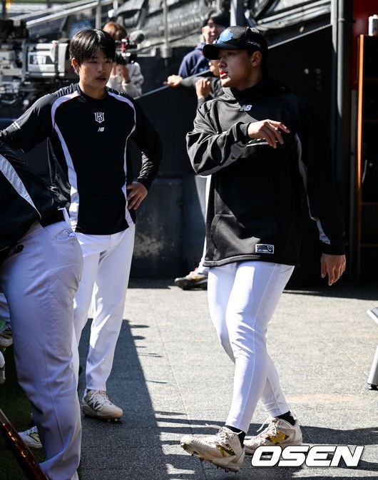 19일 경기도 수원 KT위즈파크에서 ‘2026 신한 SOL KBO리그’ 시범경기 KT 위즈와 키움 히어로즈의 경기가 열린다. 시범경기는오는 24일까지 각 팀당 12경기씩 총 60경기가 펼쳐진다. KT 안현민이 손민석에게 타격 자세를 설명하고 있다. 2026.03.19 /cej@osen.co.kr