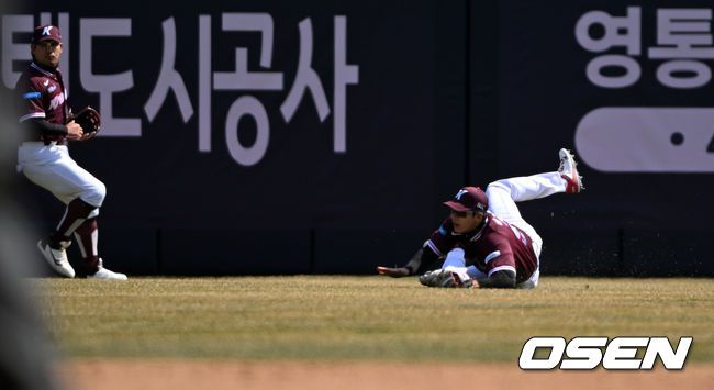 19일 경기도 수원 KT위즈파크에서 ‘2026 신한 SOL KBO리그’ 시범경기 KT 위즈와 키움 히어로즈의 경기가 열렸다. KT는 선발 투수로 보쉴리를, 키움은 김윤하를 마운드에 올렸다. 4회말 1사 2,3루에서 키움 중견수 이주형이 KT 한승택의 희생플라이 때 타구를 포구하고 있다. 2026.03.19 /cej@osen.co.kr