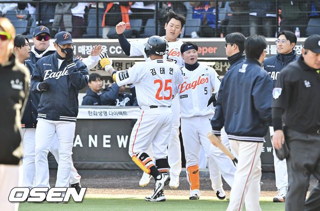 19일 오후 대전 한화생명볼파크에서 2026 신한 SOL KBO 리그 시범경기 한화 이글스와 KIA 타이거즈의 경기를 진행됐다. 한화와 KIA는 시범경기에서 각각 2승 4패, 2승 1무 3패를 기록 중이다. 9회말 한화 김태연이 끝내기 2점 홈런을 날리고 동료들의 축하를 받고 있다. 2026.03.19 / soul1014@osen.co.kr