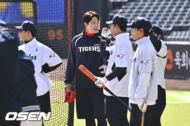 20일 오후 대전 한화생명볼파크에서 2026 신한 SOL KBO 리그 시범경기 한화 이글스와 KIA 타이거즈의 경기를 진행됐다. 전날 한화는 4-5로 끌려가다 9회말 허인서의 동점 홈런과 김태연의 끝내기 홈런으로 7-5 역전승을 거두고 2연패를 끊었다. 경기 앞두고 KIA 이태양이 한화 선수들과 즐거운 대화를 나누고 있다. 2026.03.20 / soul1