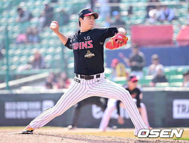 20일 인천 SSG랜더스필드에서 ‘2026 신한 SOL KBO리그’ 시범경기 SSG 랜더스와 LG 트윈스 경기가 열렸다. 홈팀 SSG는 김민준, 방문팀 LG는 요니 치리노스를 선발로 내세웠다. 7회말 마운드에 오른 LG 이정용이 힘차게 공을 뿌리고 있다. 2026.03.20 / dreamer@osen.co.kr
