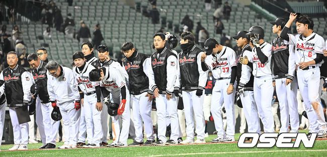 20일 울산 문수야구장에서 2026 메디힐 KBO 퓨처스리그 울산 웨일즈와 롯데 자이언츠의 경기가 열렸다. 울산은 오카다를 선발로, 롯데는 현도훈을 선발로 출전시켰다. 울산 웨일즈 선수들이 1-3으로 패한 후 팬들에게 감사 인사를 하고 있다. 2026.03.20 / foto0307@osen.co.kr