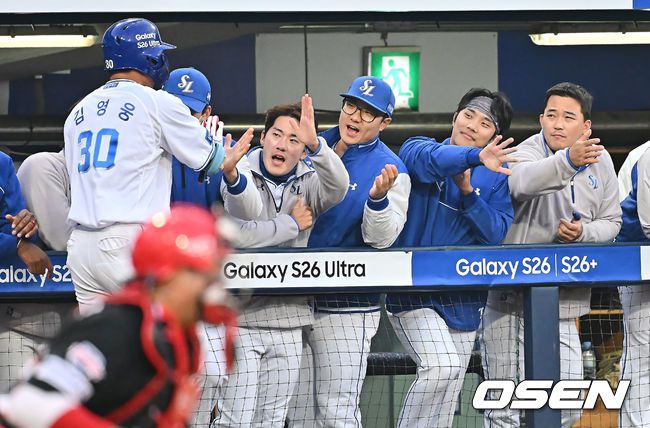 23일 대구삼성라이온즈파크에서 2026 신한 SOL KBO 리그 시범경기 삼성 라이온즈와 KIA 타이거즈의 경기가 열렸다. 홈팀 삼성은 양창섭이, 방문팀 KIA는 양현종이 선발 출전했다. 삼성 라이온즈 김영웅이 2회말 1사 우월 솔로 홈런을 치고 동료들의 축하를 받고 있다. 2026.03.23 / foto0307@osen.co.kr