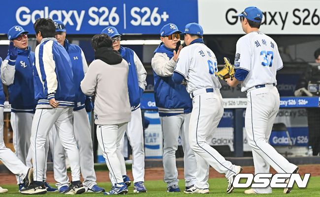 23일 대구삼성라이온즈파크에서 2026 신한 SOL KBO 리그 시범경기 삼성 라이온즈와 KIA 타이거즈의 경기가 열렸다. 홈팀 삼성은 양창섭이, 방문팀 KIA는 양현종이 선발 출전했다. 삼성 라이온즈 선수들이 7-1로 승리한 후 코치진과 하이파이브를 하고 있다. 2026.03.23 / foto0307@osen.co.kr