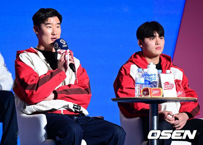 2026 신한 SOL KBO 리그 미디어데이&팬페스트 행사가 26일 서울 송파구 롯데호텔 월드에서 열렸다. 2026 KBO 리그 정규 시즌은 오는 28일 인천(KIA-SSG), 잠실(LG-KT), 대구(삼성-롯데), 창원(NC-두산), 대전(한화-키움) 등 5개 구장에서 개막한다. SSG 오태곤, 조병현이 각오를 밝히고 있다. 2026.03.26 /cej@