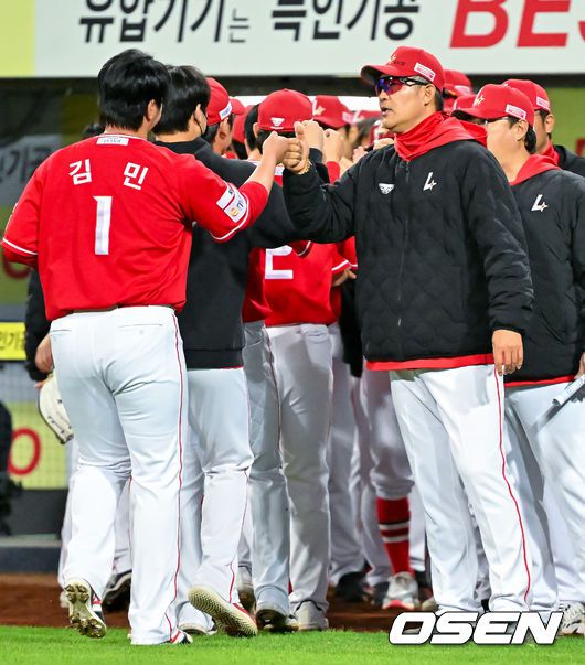 22일 오후 대구삼성라이온즈파크 ‘2026 신한 SOL Bank KBO리그' 삼성 라이온즈와 SSG 랜더스와 경기가 열렸다. 이 경기에서 SSG이 삼성에 3-2로 승리하며 2연승 질주를 했다. 반면 삼성은 지난 19일 대구 LG 트윈스전 이후 3연패 수렁에 빠졌다. 경기를 마치고 SSG 김민이 이숭용 감독과 하이파이브를 하고 있다. 2026.04.22 /