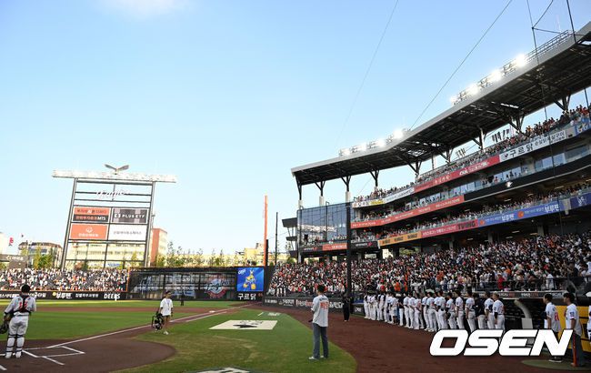 [OSEN=대전, 이대선 기자] 10일 오후 대전 한화생명볼파크에서 2025 신한 SOL Bank KBO리그 한화 이글스와 KIA 타이거즈의 경기가 열렸다. 한화는 황준서, KIA는 네일을 선발로 내세웠다. 경기에 앞서 관중 및 선수단이 애국가를 제창하고 있다. 2025.07.10 /sunday@osen.co.kr 이 기사의 카테고리는 언론사의 분류를 따릅니다.0공유하기