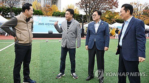 (서울=연합뉴스) 우원식 국회의장(오른쪽 두번째)과 더불어민주당 정청래 대표(오른쪽), 국민의힘 장동혁 대표(왼쪽)가 8일 서울 여의도 국회의사당 운동장에서 한국사진기자협회가 연 '2025 사진기자가족 체육대회'에 방문, 이호재 한국사진기자협회장과 대화하고 있다. 2025.11.8 [사진공동취재단] photo@yna.co.kr ▶제보는 카카오톡 okjebo