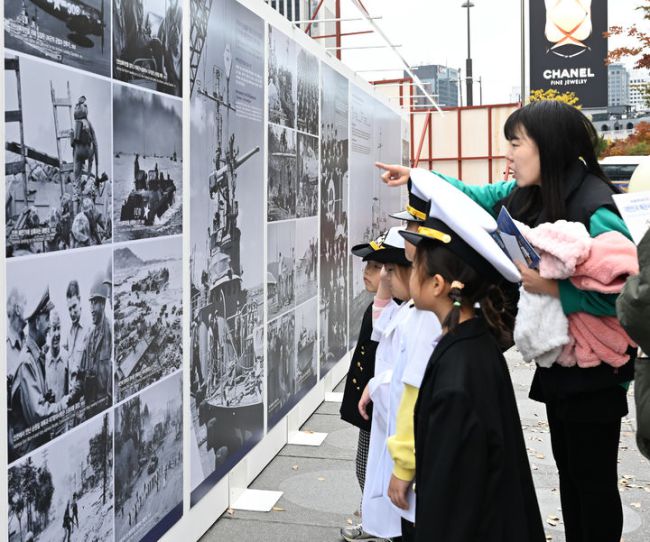 [서울=뉴시스] 권창회 기자 = 8일 서울 종로구 광화문광장에서 열린 대한민국해군 창설 80주년 'NAVY WEEK in Seoul(네이비위크 인 서울)' 행사에 참가한 어린이들이 국민들이 해군 창군 역사 사진전을 관람하고 있다. (사진= 해군 제공) 2025.11.08. photo@newsis.com *재판매 및 DB 금지 [사진 영상 제보받습니다] 공감