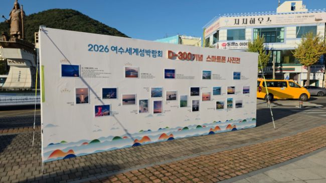 ‘여수세계섬박람회 D-300 섬 사진 전시회’가 열리고 있는 이순신광장. 여수시 제공 2026여수세계섬박람회조직위가 섬박람회 개막 D-300일을 기념해 여수 곳곳에서 ‘섬愛시선’ 사진 전시회를 개최한다. 이번 전시에서는 최근 조직위가 진행한 스마트폰 사진 공모전을 통해 선정된 아름다운 섬 전경 등 23점의 우수 작품을 선보인다. 현재 전시는 여수엑스포역과