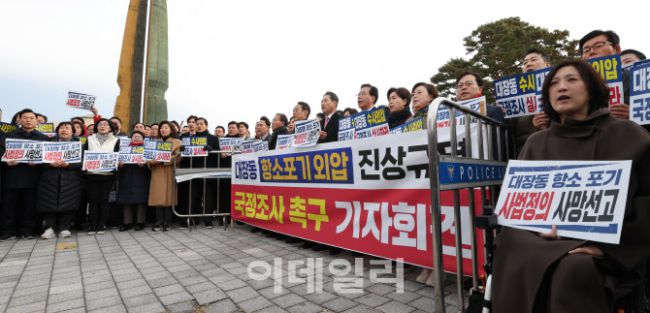 장동혁 국민의힘 대표와 송언석 원내대표를 비롯한 의원들이 17일 오전 서울 용산구 전쟁기념관 앞에서 열린 대장동 항소포기 외압 진상규명 국정조사 촉구 기자회견에서 규탄 구호를 외치고 있다.