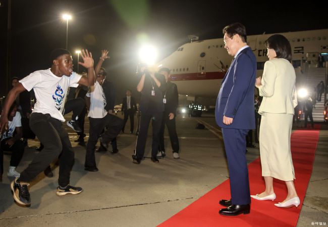 G20 정상회의에 참석하는 이재명 대통령과 김혜경 여사가 21일(현지 시간) 남아프리카공화국 요하네스버그 O.R. 탐보 국제공항에 도착해 공군1호기에서 내려 환영공연을 보고 있다. 요하네스버그=송은석 기자 silverstone@donga.com G20 정상회의에 참석하는 이재명 대통령과 김혜경 여사가 21일(현지 시간) 남아프리카공화국 요하네스버그 O.R.