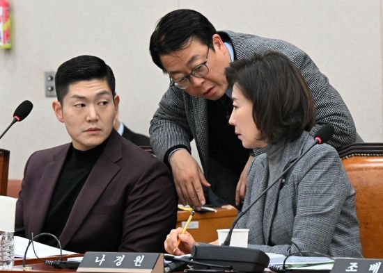 8일 국회에서 열린 법제사법위원회 법안심사제1소위원회에서 국민의힘 나경원, 곽균택, 김재섭 의원이 대화하고 있다. <ⓒ투자가를 위한 경제콘텐츠 플랫폼, 아시아경제(www.asiae.co.kr) 무단전재 배포금지>