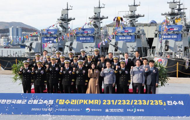 신형 고속정(PKMR) Batch-Ⅱ 1~4번함인 참수리-231·232·233·235호정 통합진수식이 8일 부산 영도구 HJ중공업 영도조선소에서 안상민 해군군수사령관 내외와 유상철 HJ중공업 대표이사(앞줄 왼쪽 다섯째부터) 등이 참석한 가운데 열렸다. 230t급, 길이 45m인 신형 고속정은 130㎜ 유도로켓과 12.7㎜ 원격사격통제체계에 대한 통제·발사