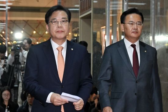 송언석(왼쪽) 국민의힘 원내대표가 9일 국회에서 우원식 국회의장, 김병기 더불어민주당 원내대표와 회동을 갖기 위해 의장실로 향하고 있다. <ⓒ투자가를 위한 경제콘텐츠 플랫폼, 아시아경제(www.asiae.co.kr) 무단전재 배포금지>