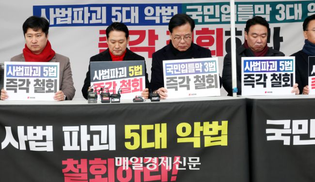 국민의힘, 8대 악법 저지를 위한 릴레이 천막농성 돌입 국민의힘 장동혁 대표와 송언석 원내대표 등 당 지도부가 10일 국회 본청 앞에서 더불어민주당의 쟁점 법안 추진을 저지하기 위한 천막 농성에 돌입하고 있다. 국민의힘은 이른바 ‘8대 악법’ 저지 시점까지 농성을 이어갈 방침이다. 2025.12.10.김재훈기자 [ⓒ 매일경제 & mk.co.kr, 무단 전재