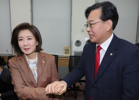 송언석 국민의힘 원내대표가 10일 서울 여의도 국회에서 현안관련 기자회견에 앞서 나경원 의원과 대화를 나눈 뒤 손을 잡고 있다. <ⓒ투자가를 위한 경제콘텐츠 플랫폼, 아시아경제(www.asiae.co.kr) 무단전재 배포금지>