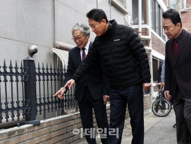 오세훈 서울시장이 10일 오후 영등포구 대림1구역 신속통합기획 재개발 추진 지구를 방문해 현장을 살펴보고 있다. 주거환경개선 대림1구역은 상습 침수 취약지로 서울시는 주택공급과 재난예방을 동시에 잡는 맞춤형 재개발을 추진한다고 밝혔다. 오 시장은 “주민들의 어려움이 빠르고 정확하게 해결하도록 현장의 목소리를 가까이에서 듣고 개선이 필요하다면 정부에 분명히