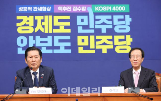 정청래 더불어민주당 대표가 11일 서울 여의도 국회에서 이석연 국민통합위원장을 접견, 발언하고 있다.
