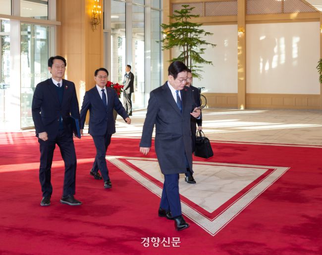 이재명 대통령이 26일 서울 용산 대통령실 정현관에서 용산 대통령실 청사 마지막 출근을 하고 있다. 2025.12.26 대통령실 제공 이재명 대통령이 26일 용산 대통령실로 마지막 출근을 했다. 대통령실은 이날 오전 이 대통령이 용산 대통령실 청사 정현관을 통해 출근하는 모습이 담긴 사진을 언론에 공개했다. 이날 열리는 순직 경찰·소방 공무원 유가족 초청