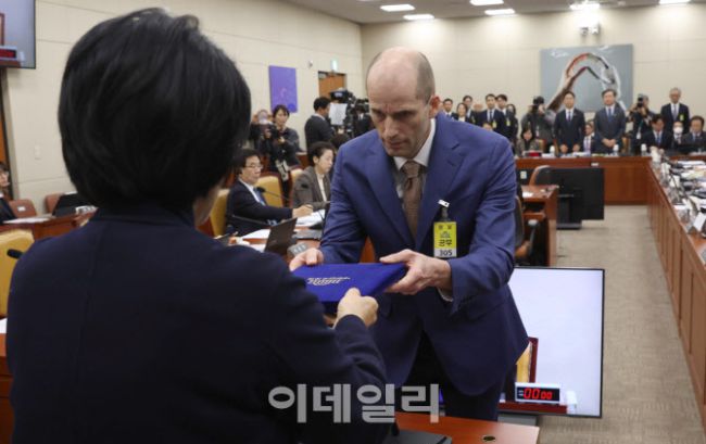 해롤드 로저스 쿠팡 대표이사가 31일 서울 여의도 국회에서 열린 쿠팡 침해사고 및 개인정보 유출, 불공정 거래, 노동환경 실태 파악과 재발방지 대책 마련을 위한 청문회에서 출석, 선서문을 최민희 과방위원장에게 전달하고 있다.