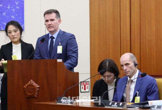 브랫 매티스(왼쪽 두번째) 쿠팡 최고정보보안책임자가 31일 서울 여의도 국회에서 열린 쿠팡 침해사고 및 개인정보 유출, 불공정 거래, 노동환경 실태 파악과 재발방지 대책 마련을 위한 청문회에서 출석, 질의에 답변하고 있다. 오른쪽은 해롤드 로저스 쿠팡 대표이사.