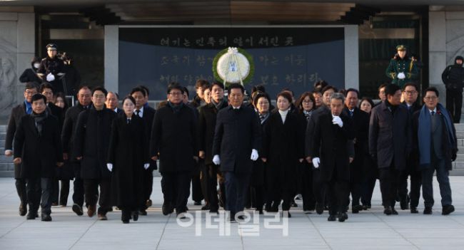 정청래 더불어민주당 대표와 의원들이 새해 첫날인 1일 서울 동작구 국립서울현충원에서 현충탑에 참배 마치고 이동하고 있다.