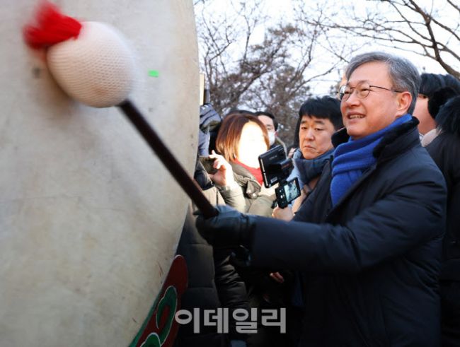 장인홍 구로구청장이 1일 매봉산 일대에서 열린 ‘2026 병오년 해맞이 행사’에서 대북을 울리며 새해의 시작을 알리고 있다. 이날 행사에는 장인홍 구로구청장을 비롯한 국회의원, 시·구의원, 주민 등 1,500여 명이 참여해 일출을 바라보며 건강과 행복을 기원했다. ‘해맞이 행사’는 매년 새해 첫날 열리는 구로구의 대표 행사로, 구민들이 일출을 함께 보며 새