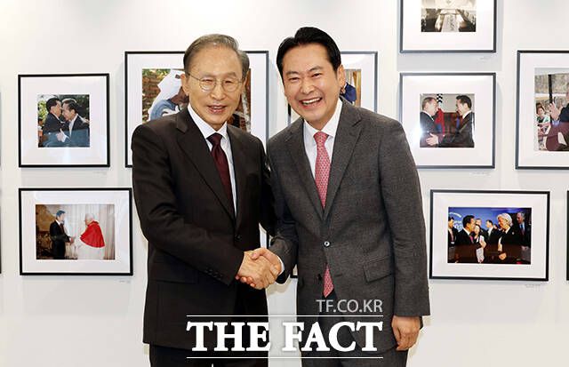 장동혁 국민의힘 대표(오른쪽)가 2일 오전 서울 서초구 영포빌딩에서 이명박 전 대통령을 만나 인사를 나누고 있다. /국회사진기자단 장동혁 국민의힘 대표(오른쪽)가 2일 오전 서울 서초구 영포빌딩에서 이명박 전 대통령을 만나 인사를 나누고 있다. 이날 장동혁 국민의힘 대표는 이명박 전 대통령에게 외연 확장 등 당 운영 방안과 지방선거 전략에 관한 조언을 들었