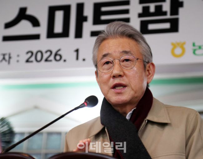 강호동 농협중앙회장이 5일 새해 첫 현장경영으로 충남 논산 강경농협에서 열린 ‘농협금융-농협경제 보급형 스마트팜 협력사업 기념식’에 참석해 인사말을 하고 있다. 이번 기념식은 농협금융-경제 두 부문의 보급형 스마트팜 공급 확대를 위한 협력사업의 성과를 조명하고, 관내 스마트팜 농가의 운영 현황과 생육 동향을 점검하기 위해 마련됐다. 보급형 스마트팜은 기존