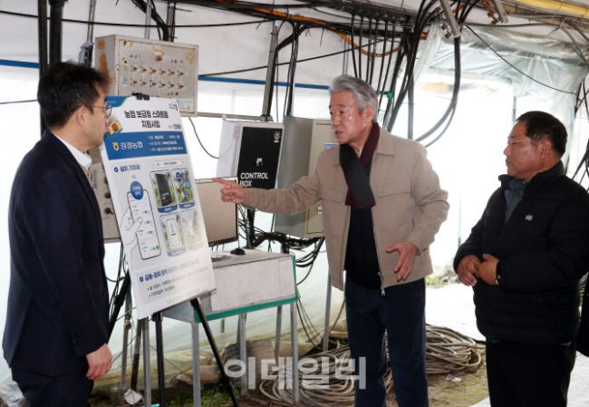 강호동(가운데) 농협중앙회장이 5일 새해 첫 현장경영으로 충남 논산 강경농협에서 열린 ‘농협금융-농협경제 보급형 스마트팜 협력사업 기념식’을 갖고 스마트팜 농장에서 관계자 등과 시설현황을 논의하고 있다. 이번 기념식은 농협금융-경제 두 부문의 보급형 스마트팜 공급 확대를 위한 협력사업의 성과를 조명하고, 관내 스마트팜 농가의 운영 현황과 생육 동향을 점검하