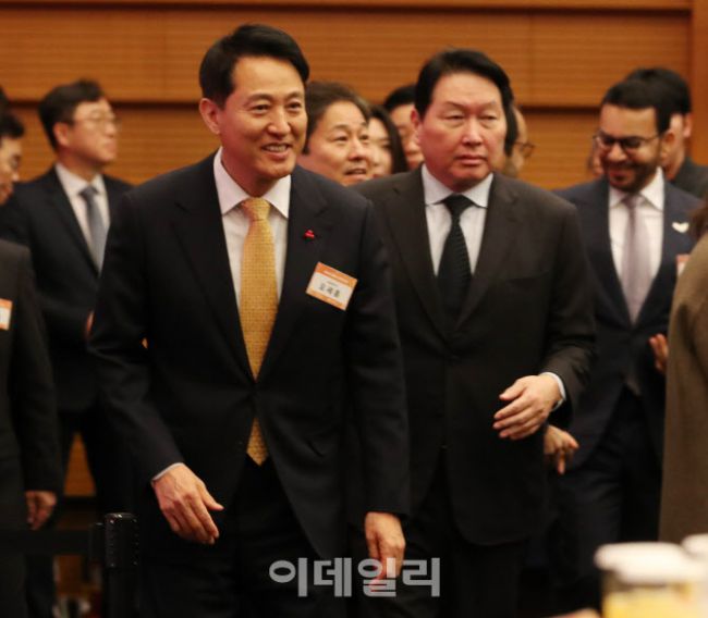 오세훈(왼쪽) 서울시장과 최태원 서울상공회의소 회장 등이 7일 서울 중구 대한상의에서 열린 2026년 신년인사회에 참석하고 있다. 이날 신년인사회에는 서울시의회 의장, 서울시교육감, 국회의원, 시의원, 주한외교사절 등 각계인사 약 900여 명이 참석했다.