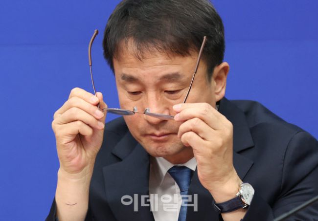 한병도 더불어민주당 원내대표가 12일 오전 서울 여의도 국회에서 열린 최고위원회의에서 모두발언 후 안경을 쓰고 있다.