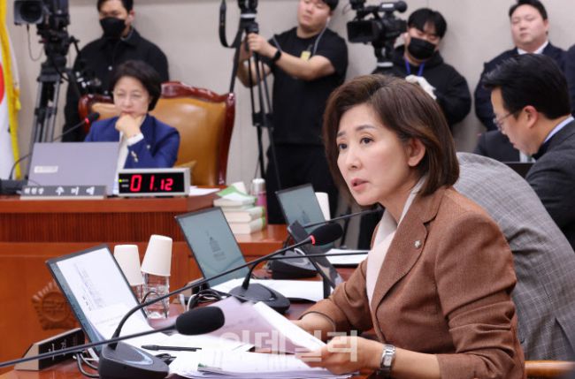 나경원 국민의힘 의원이 12일 오후 서울 여의도 국회에서 법제사법위원회 전체회의에서 질의를 하고 있다.