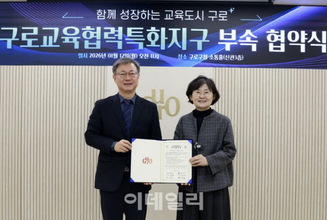 장인홍(왼쪽) 구로구청장과 한미라 서울특별시남부교육지원청 교육장이 12일 구로구청 소통홀에서 ‘구로교육협력특화지구 부속 합의 협약식’을 체결하고 있다. 이번 부속합의는 자치구·교육지원청·지역사회가 함께 참여하는 협력 체계를 강화해 지역 기반 교육환경을 조성하고, 어린이·청소년의 배움과 전인적 성장을 지원하기 위해 마련됐다. ‘구로교육협력특화지구’는 지역의