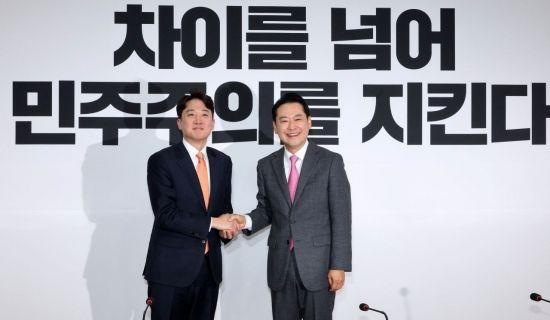 장동혁 국민의힘 대표(오른쪽)과 이준석 개혁신당 대표가 13일 국회에서 만나 악수하고 있다. <ⓒ투자가를 위한 경제콘텐츠 플랫폼, 아시아경제(www.asiae.co.kr) 무단전재 배포금지>
