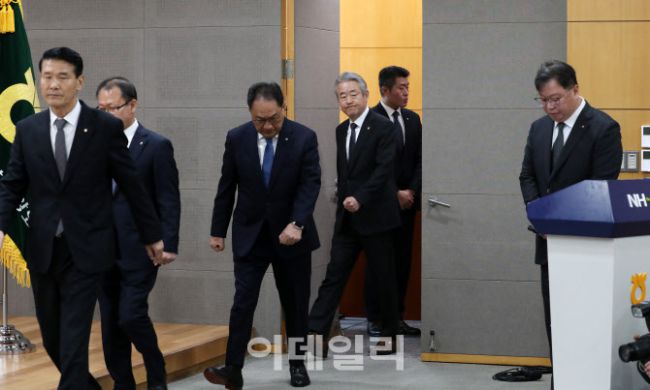 [포토] 기자회견 입장하는 강호동 농협회장과 계열사 대표들
