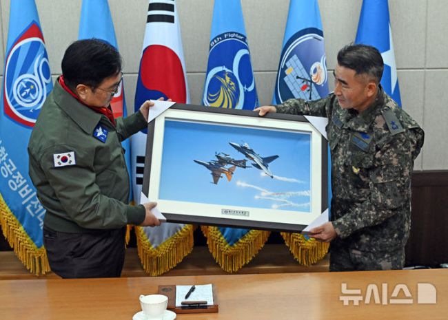 [서울=뉴시스] 국회사진기자단 = 우원식 국회의장이 14일 강원도 원주시 제8전투비행단을 위문 방문, 이긍규 8전투비행단장에게 전투기 사진액자를 전달받고 있다. 2026.01.14. photo@newsis.com [사진 영상 제보받습니다] 공감언론 뉴시스가 독자 여러분의 소중한 제보를 기다립니다. 뉴스 가치나 화제성이 있다고 판단되는 사진 또는 영상을 뉴시