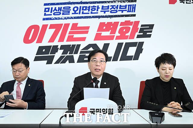 송언석 국민의힘 원내대표(가운데)가 16일 오전 서울 여의도 국회에서 현안 관련 기자회견을 열고 발언하고 있다. /국회=박헌우 기자 송언석 국민의힘 원내대표(가운데)가 16일 오전 서울 여의도 국회에서 현안 관련 기자회견을 열고 발언하고 있다. 송언석 원내대표는 이재명 대통령에게 "국정 기조 전환을 논의하기 위한 여야 단독 영수회담을 하자"고 제안했다. 송