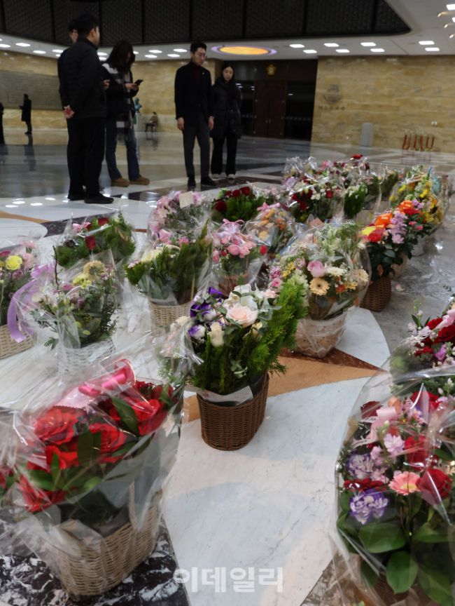 장동혁 국민의힘 대표가 18일 서울 여의도 국회 로텐더홀에서 더불어민주당의 통일교 및 공천뇌물 특검 수용을 촉구하며 4일째 단식을 이어가고 있는 가운데 장 대표를 응원하는 꽃다발이 놓여 있다.
