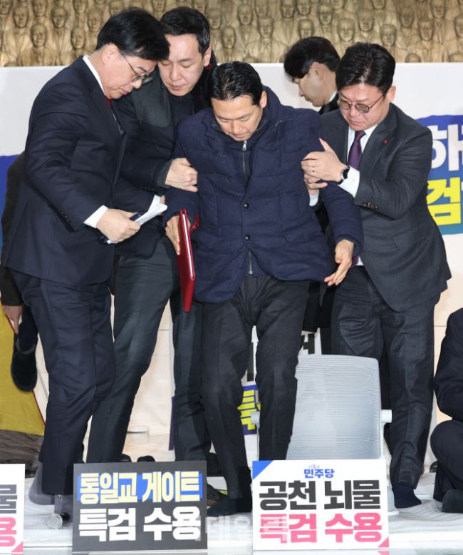 장동혁 국민의힘 당대표가 19일 서울 여의도 국회 로텐더홀에서 열린 최고위원회의에서 회의 종료 후, 송언석 원내대표 등의 부축을 받으며 자리에서 일어나고 있다.