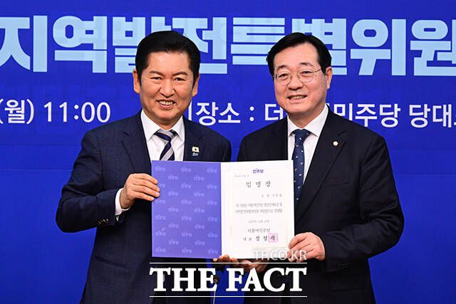 정청래 더불어민주당 대표(왼쪽)가 19일 오전 서울 여의도 국회에서 열린 영남인재육성 및 지역발전특별위원회 출범식에서 민홍철 영남인재육성 및 지역발전특별위원회 위원장에게 임명장을 전달하고 있다. /국회=남윤호 기자 정청래 더불어민주당 대표가 19일 오전 서울 여의도 국회에서 열린 영남인재육성 및 지역발전특별위원회 출범식에서 민홍철 영남인재육성 및 지역발전특