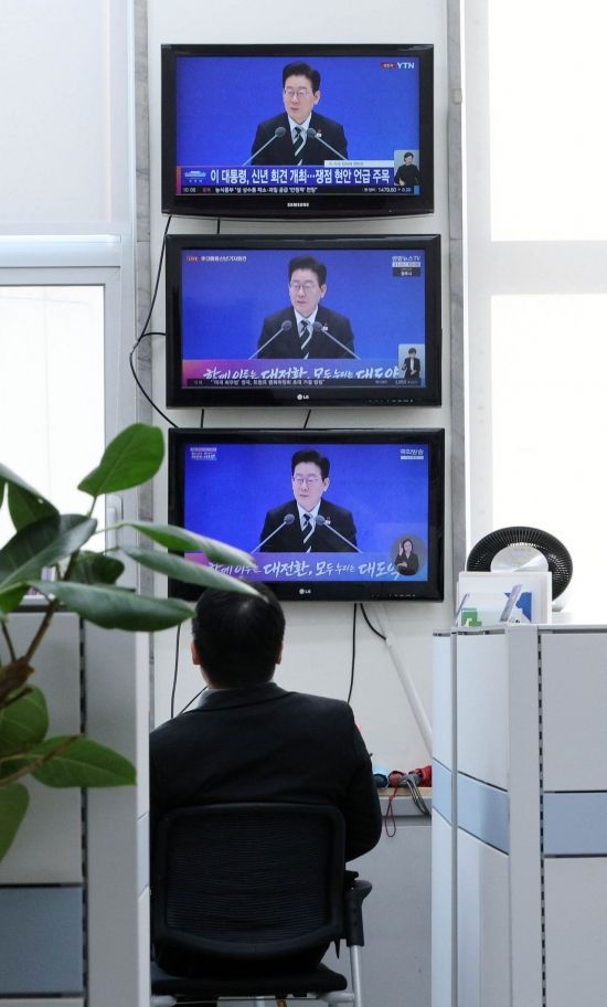 21일 국회 국민의힘 원내대표실에 설치된 화면에 이재명 대통령 신년 기자회견 생중게 화면이 나오고 있다. <ⓒ투자가를 위한 경제콘텐츠 플랫폼, 아시아경제(www.asiae.co.kr) 무단전재 배포금지>