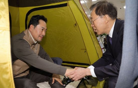 통일교·공천헌금 '쌍특검' 수용을 요구하며 단식 중인 국민의힘 장동혁 대표가 21일 국회 로텐더홀 단식 농성장을 찾은 이석연 국민통합위원장과 인사하고 있다. <ⓒ투자가를 위한 경제콘텐츠 플랫폼, 아시아경제(www.asiae.co.kr) 무단전재 배포금지>