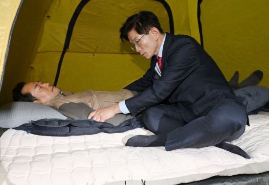 김문수 전 고용노동부 장관이 21일 국회 로텐더홀에서 통일교·공천헌금 '쌍특검' 수용을 요구하며 이레째 단식 농성 중인 장동혁 국민의힘 대표를 방문하고 있다. <ⓒ투자가를 위한 경제콘텐츠 플랫폼, 아시아경제(www.asiae.co.kr) 무단전재 배포금지>