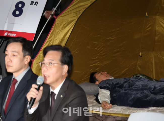 통일교 및 공천헌금 특검 수용을 촉구하며 8일째 단식을 이어가고 있는 장동혁 국민의힘 대표가 22일 서울 여의도 국회 로텐더홀 농성장에 마련된 텐트 안에 누워 있다. 송언석 원내대표가 최고위원회의에서 모두발언을 하고 있다.