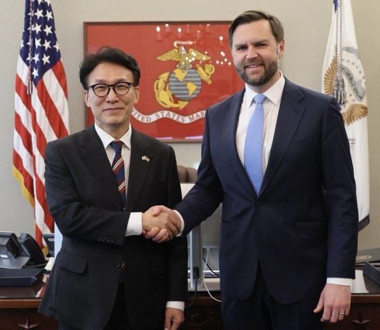 김민석 국무총리가 23일(현지시간) 미국 워싱턴DC 백악관에서 JD 밴스 부통령과 면담에 앞서 악수를 하고 있다. [총리실 제공] <ⓒ투자가를 위한 경제콘텐츠 플랫폼, 아시아경제(www.asiae.co.kr) 무단전재 배포금지>