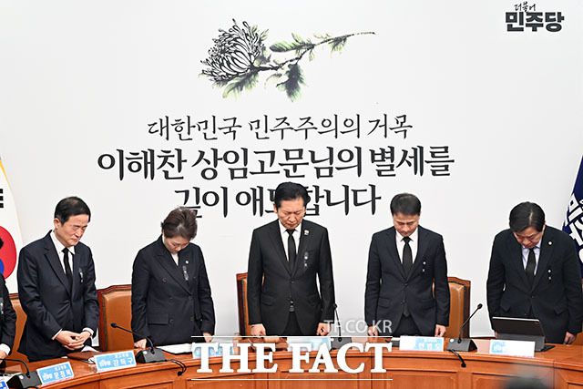 정청래 더불어민주당 대표(가운데)와 지도부가 26일 오전 서울 여의도 국회에서 열린 최고위원회의에서 이해찬 전 국무총리의 별세를 애도하며 묵념하고 있다. nyh5504@tf.co.kr 사진영상기획부 photo@tf.co.kr 발로 뛰는 더팩트는 24시간 여러분의 제보를 기다립니다. ▶카카오톡: '더팩트제보' 검색 ▶이메일: jebo@tf.co.kr ▶뉴스