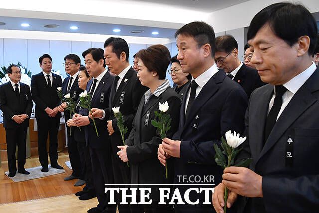 정청래 더불어민주당 대표와 한병도 원내대표, 최고위원 등 민주당 지도부가 28일 오전 서울 종로구 서울대학교병원 장례식장에 마련된 고 이해찬 전 국무총리의 빈소에서 조문을 하고 있다. /사진공동취재단 정청래 더불어민주당 대표가 국화꽃을 받아들고 있다. [더팩트 | 사진공동취재단] 정청래 더불어민주당 대표와 한병도 원내대표, 최고위원 등 민주당 지도부가 28