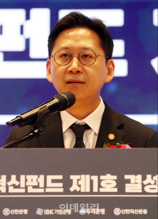 배경훈 부총리 겸 과학기술정보통신부 장관이 23일 여의도TP타워에서 열린 ‘과학기술혁신펀드 제1호 결성식’에서 인사말을 하고 있다. 과학기술펀드는 반도체 디스플레이 AI 첨단모빌리티 등 12대 국가전략기술 분야와 기술사업화 기업에 중점 투자하기 위해 민간 주도로 약 1조 원 규모 조성을 목표로 하고 있다. 배경훈 부총리는 “우수한 기술력을 갖춘 기업들이 성
